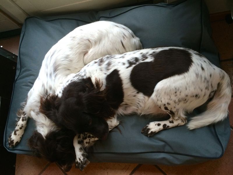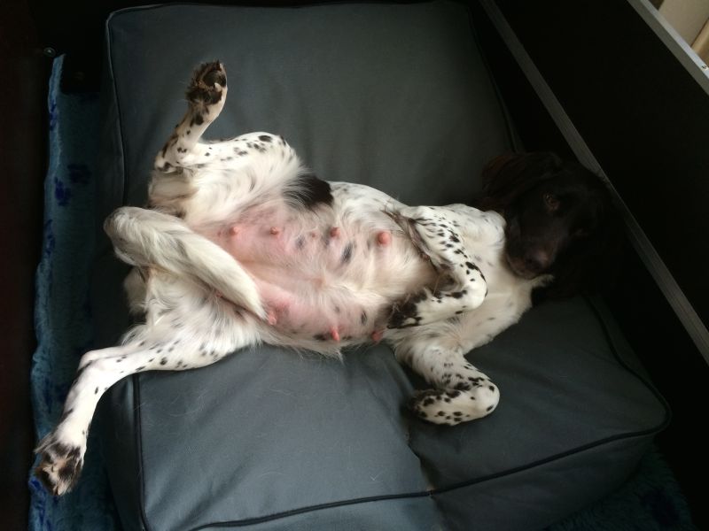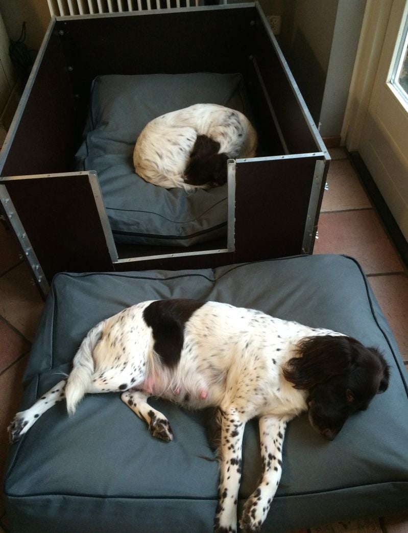 10 DECEMBER; Bente is 7 weken drachtig en dat is zeer goed te zien. Haar buikje lijkt nu met de dag te groeien. Het gaat heel goed met haar. We voelen al volop bewegingen in de buik en dat is weer heel bijzonder om mee te maken. We doen het ook wat rustiger aan met haar en dagelijkse wandelingen zijn ook niet meer groot en lang. Bente zoekt mij overal op en ligt het liefste bij ons. Deze week is mijn laatste werkweek en dan beginnen mijn vrije dagen om voor het komend nest te gaan zorgen. Bijzondere en ook spannende periode breekt aan; gezondheid rondom Bente en haar komende pups zijn nu heel belangrijk. Hierbij een foto van een relaxte dame...