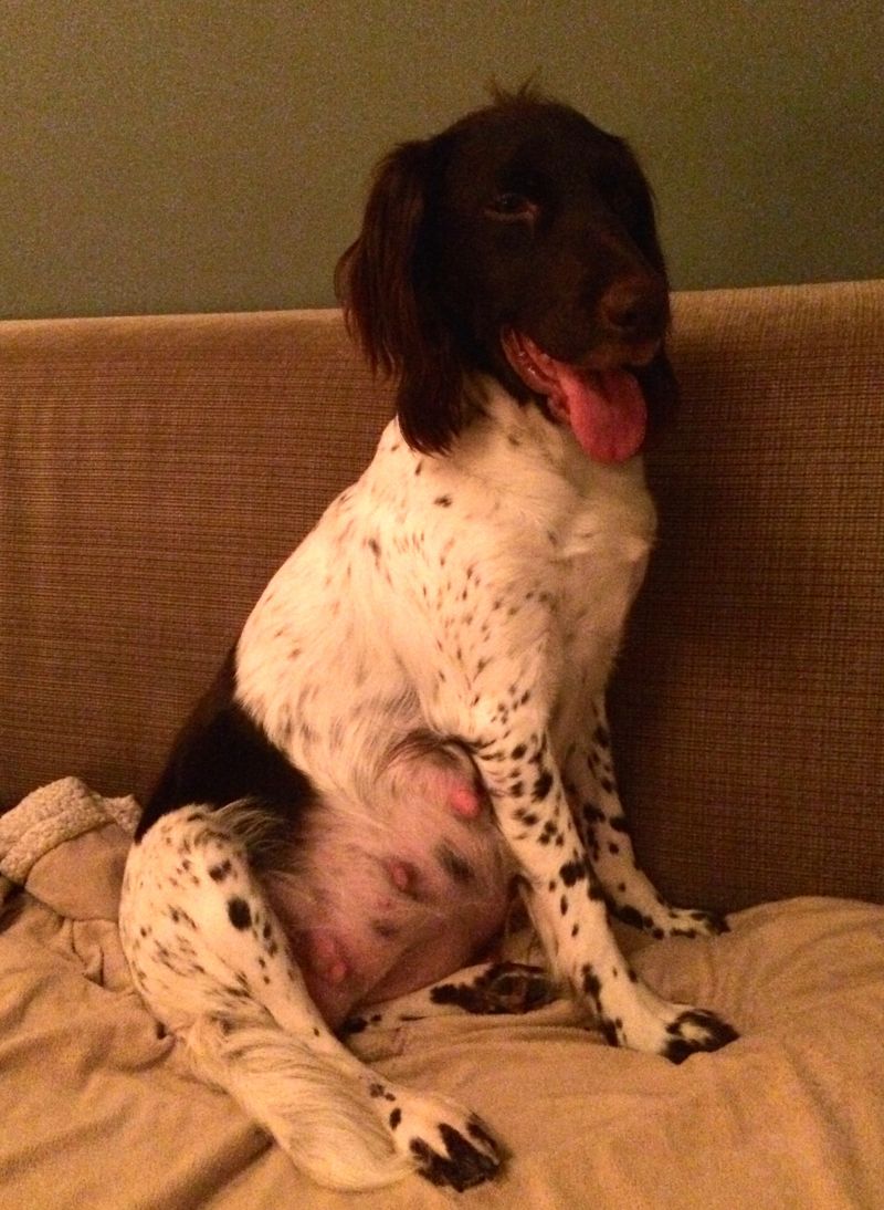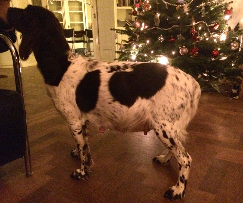 7 DECEMBER; Het gaat heel goed met Bente, ze is heel relaxed en vooral heel knuffelig. Het uitdagend spelen met Puck doet ze ook veel rustiger. Mooi is dat hoe ze haar buik daarin beschermd. Vooral op haar groeiend buikje wordt ze graag geaaid. Hier een foto 6 1/2 week drachtig.