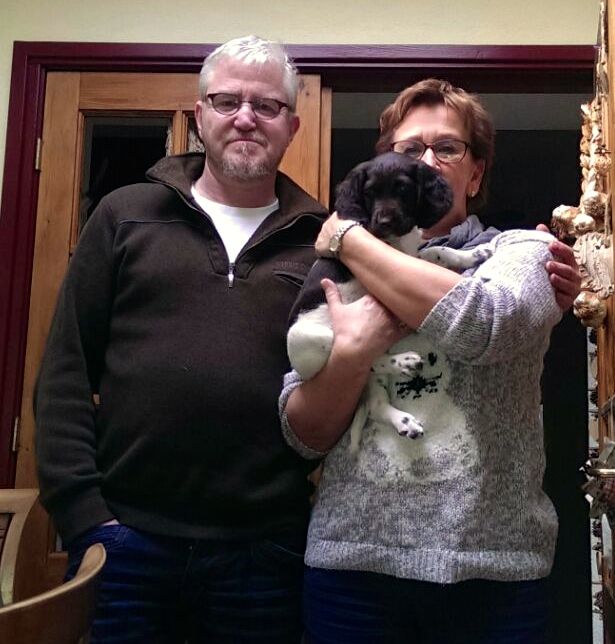 15 FEBRUARI; De laatste 3 dagen zijn Meggie en Dobber nog bij elkaar geweest en ze waren dan ook onafscheidelijk. Mooi om te te zien hoe snel puppen van deze leeftijd leren en ontdekken. Gisteren was het 14 Februari, Valentijnsdag, en wat is er mooier om dan een pup op te gaan halen. Nou dat is dus gebeurt, de 5 de pup en tevens het laatste teefje Meggie is meegegaan met Cock en Karin en ze zal, buiten gezinshond, later worden ingezet in de jacht samen Met Finn, duitse staande draadhaar van hun zoon. Ze hadden mooie voorjaars bollen voor ons meegenomen,bedankt! We kregen al vrij snel bericht dat de reis en thuiskomst zeer goed waren verlopen en ook vanmorgen kregen we bericht dat Meggie een prima nacht heeft gehad en dat ze een heerlijke pup is. Meggie heeft ook al kennis gemaakt met Finn en ook met de huiskat, wat prima is verlopen. Ook van de andere families horen we berichten dat ze erg blij zijn met hun pup. Een familie laat weten dat ze het nog leuker vinden als ze hadden verwacht....Van alle nieuwe eignenaren hebben we een foto gemaakt. Bij Meggie's baasjes dit helemaal vergeten ; dus dan maar een thuis foto. De andere fotos zijn van Meggie en Dobber! Dobber blijft nog een dikke week. Morgen begin ik weer met werken na 8 weken te zijn thuis geweest......... Een zeer bijzonder en prachtige tijd hebben we gehad en nog.