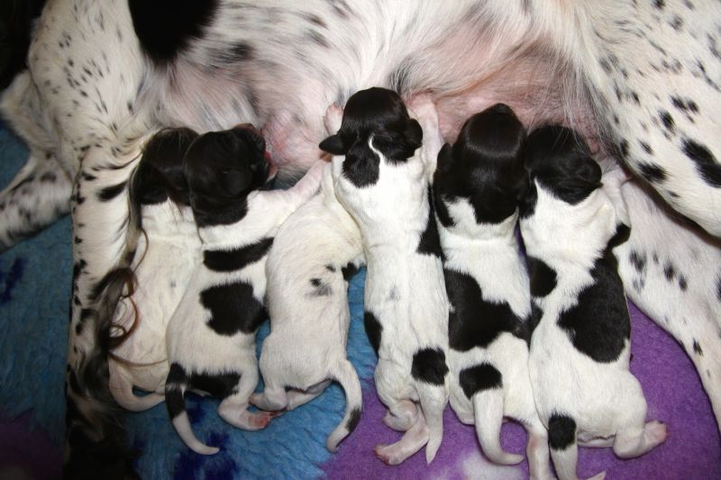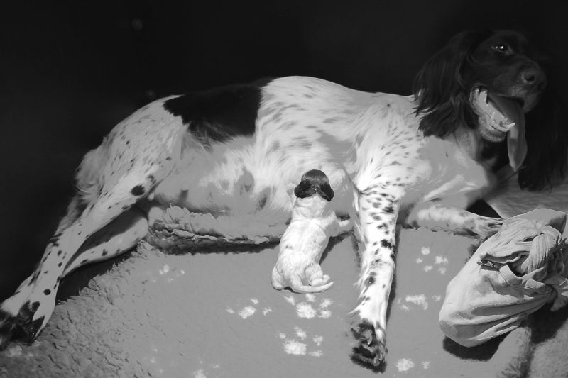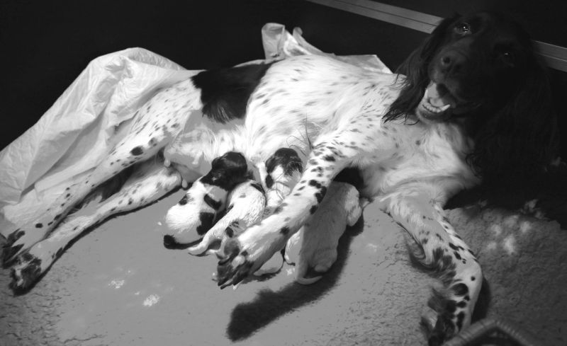 19 DECEMBER, 23.30 uur; Na een nacht en een dag vol met weeën heeft Bente een nest met puppy's ter wereld gebracht; 5 teefjes en 1 reutje. Ze zijn allemaal rond de 400 gram, dus flink van gewicht. Bente heeft het ontzettend goed gedaan en hard gewerkt. Toen haar eerste pup geboren werd moest ze even wennen, maar na haar 2de pup werd er ook een moeder 'geboren' en wist ze precies wat ze moest doen. Jan, Julia en ik zijn er de hele tijd samen bij geweest en hebben geholpen waar nodig. Julia heeft het geboorteverslag van de puppy's bijgehouden en Emiel is er eventjes bij geweest. Bente en haar kroost maken het t.n.t. heel goed; alle pupjes drinken al volop. Wij zijn zeer blij dat alles goed is gegaan en zijn apetrots op dit nest. Eerst gaan we uitrusten en morgen zullen wij de nieuwe toekomstige pup-eigenaren gaan opbellen. Voor nu al vast een voorproefje van een trotse Bente een haar gezin....De zwart-wit foto's zijn tijdens de bevalling genomen v.l.n.r eerste pupje net geboren en al meteen de weg ruikend (oogjes zijn nog dicht) naar de tepel, 4 pupjes geboren ook al drinkend en alles compleet.