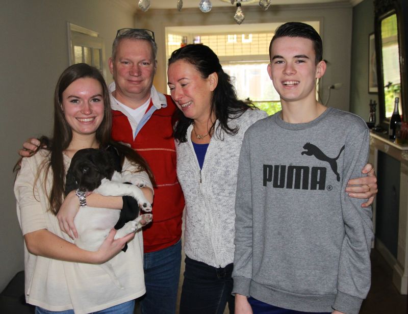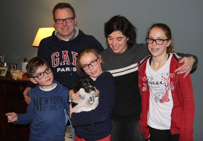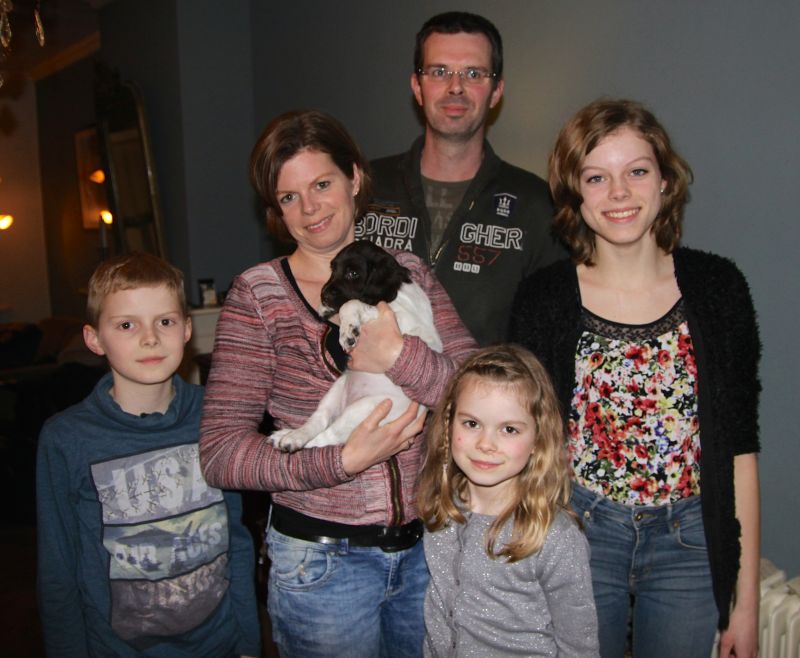 11 FEBRUARI; Gisteren en eergisteren zijn er weer 2 puppen weggegaan naar hun nieuwe gezinnen. De reis is bij beide dames heel goed verlopen; hebben allebei geslapen in de auto. Ook de nachten in de bench verlopen goed met een plasje tussendoor. Wij krijgen erg leuke foto 's en filmpjes doorgestuurd. Hartelijk dank hiervoor en ook voor alle cadeautjes, kaartjes en bloemen. Maandag 9 febr. is Fay opgehaald. Zij zal gaan wonen bij Joëlle en Richard en hun kinderen; Maureen, Hannah en Jasper. Fay werd op gehaald door Joëlle en haar schoonmoeder.