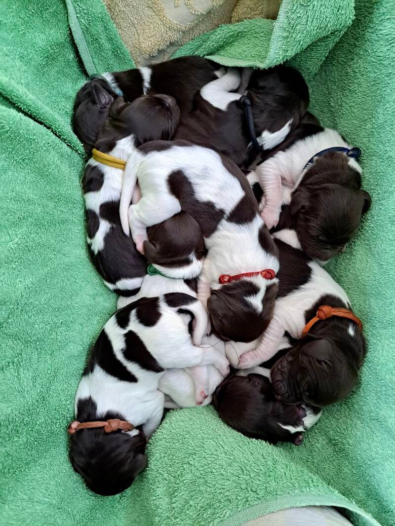 25-6-2023; Het tiental is 5 1/2 week oud. Afgelopen weekend zijn Lars en Lene uit Denemarken 2 dagen bij ons op bezoek geweest. Was bijzonder en erg leuk. Zij zijn de eigenaren van Figaro ,de vader van dit nest. Figaro kon helaas niet mee, omdat de puppy's nog niet zijn ingeënt.