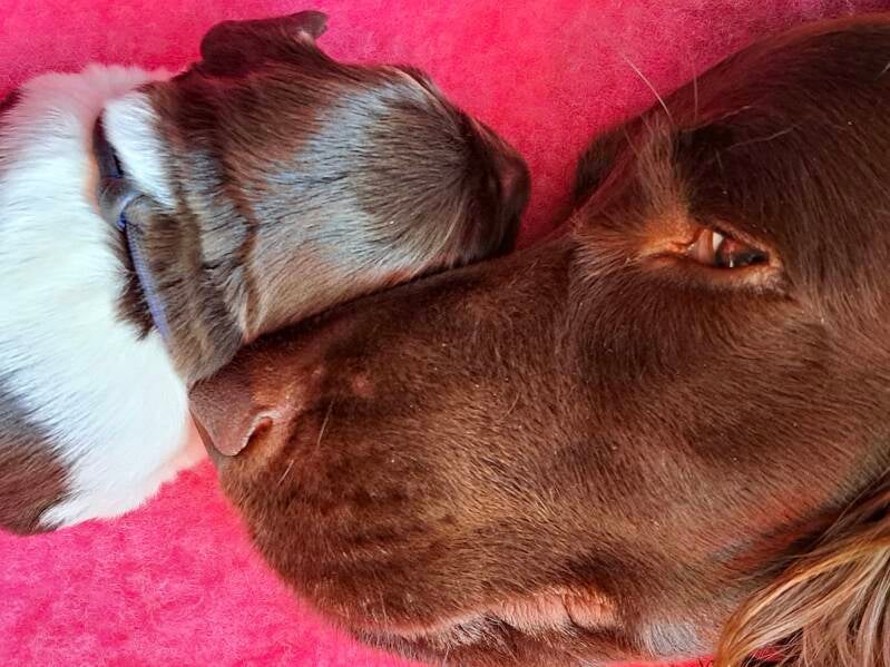 2-6-2023; 16 dagen oud; lekker slapen op mama's poot, en mooi om te zien gezien hoe de vacht zich ontwikkelt in schimmel en bruin/wit. Julia onze dochter is in de ban van de puppy's, wij ook trouwens....