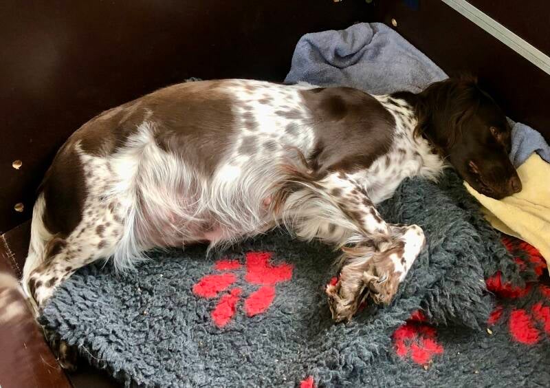18-5-2023; De eerste nacht met Daisy en haar kroost is heel goed verlopen. Ik heb geslapen op de bank. Vanmorgen werpkist schoongemaakt en dan gaan de kleintjes in een mandje met een kruik en Daisy ligt er naast. Dit zal een ritueel gaan worden de komende tijd. Daisy heeft volledig vertrouwen in wat we doen.