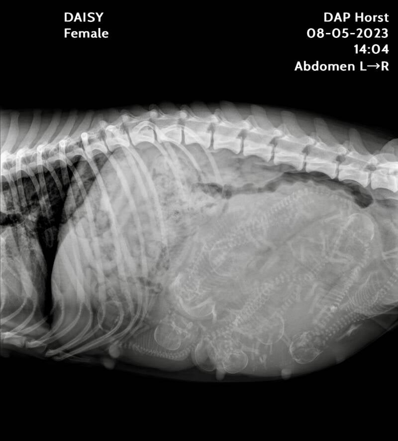 We hebben een röntgenfoto laten maken van Daisy's buik. Dit omdat ze flink groeide en we wilden weten voor haar bevalling hoeveel ze draagt. Deze foto kan geen kwaad voor haar en haar pups. Er werden door de dierenarts 10 pups geteld met twijfel over een 11 de pup. Onvoorstelbaar dat dit allemaal in haar buik zit en past....