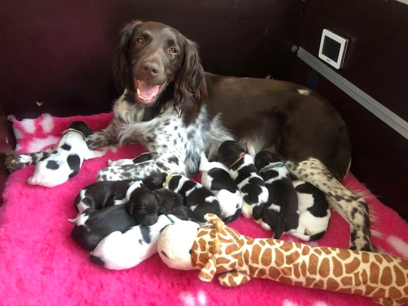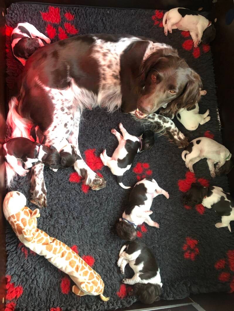 1-6-2023; Familie is 15 dagen oud. Ze hebben allemaal de eerste ontwormingspasta gehad. Lekker vonden de meesten het niet op een paar na die alles op smikkelden. Julia onze dochter is een fijne hulp en super puppen oppas, als ik het nest schoonmaak. Daisy is een heerlijke hond, super moeder zo relaxed. Ze doet het zo goed.
