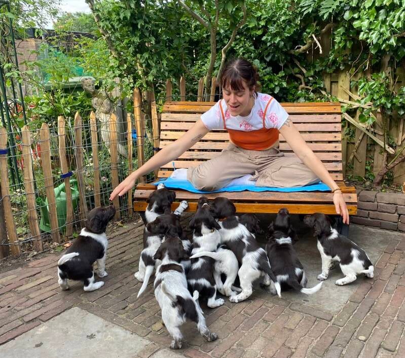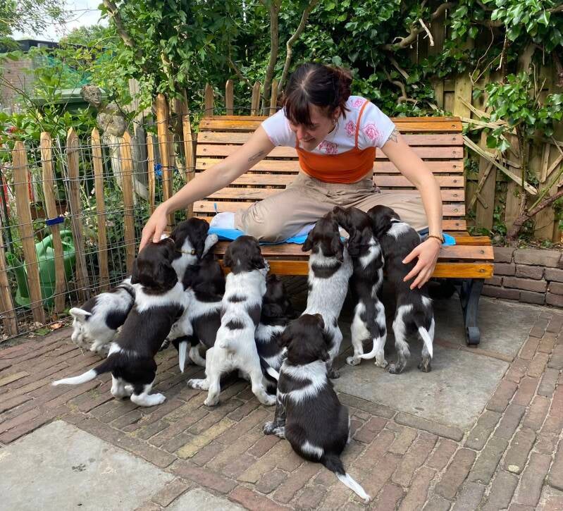 4-7-2023; Jeetje wat gaat het toch hard; Morgen is het tiental alweer 7 weken. De toekomstige eigenaren tellen af en wij genieten zo ontzettend van dit gave nest. Wat zijn ze toch leuk. Gisteren hebben we een uitje gemaakt naar een mooie boerderij buiten Nijmegen. Daar mocht het gezin helemaal even een uitje in de natuur maken samen met Daisy en Lux, Heidewachtel van Simone.